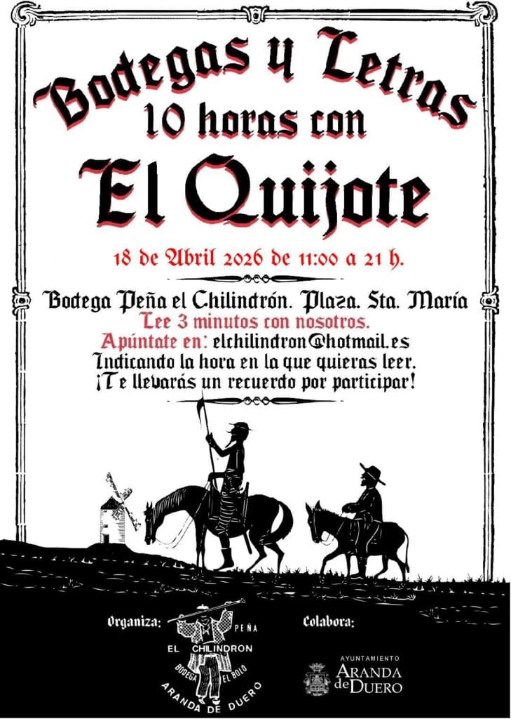 La Bodega Peña El Chilindrón propone un reto literario muy especial dentro de la Semana del Libro: leer El Quijote de forma continuada durante 10 horas, con la participación de 200 arandinos y arandinas que quieran sumarse a esta cita cultural.