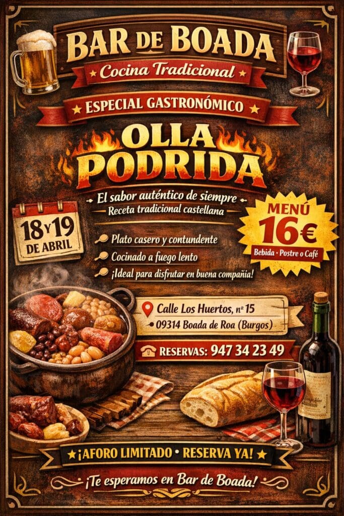 El Bar de Boada nos invita a disfrutar de un Especial Gastronómico dedicado a la Olla Podrida, el sabor auténtico de siempre elaborado con la receta tradicional castellana. Un plato casero y contundente, cocinado a fuego lento, ideal para compartir en la mejor compañía en plena Ribera del Duero.
