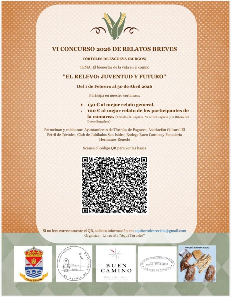 Llega el VI Certamen Literario de Relatos Breves “Tórtoles de Esgueva 2026”, una propuesta pensada para dar voz al mundo rural y sumar contenidos a la revista anual Aquí Tórtoles. En esta edición, la temática gira en torno a “El bienestar de la vida en el campo: EL RELEVO: JUVENTUD Y FUTURO”, con el relato breve como protagonista.